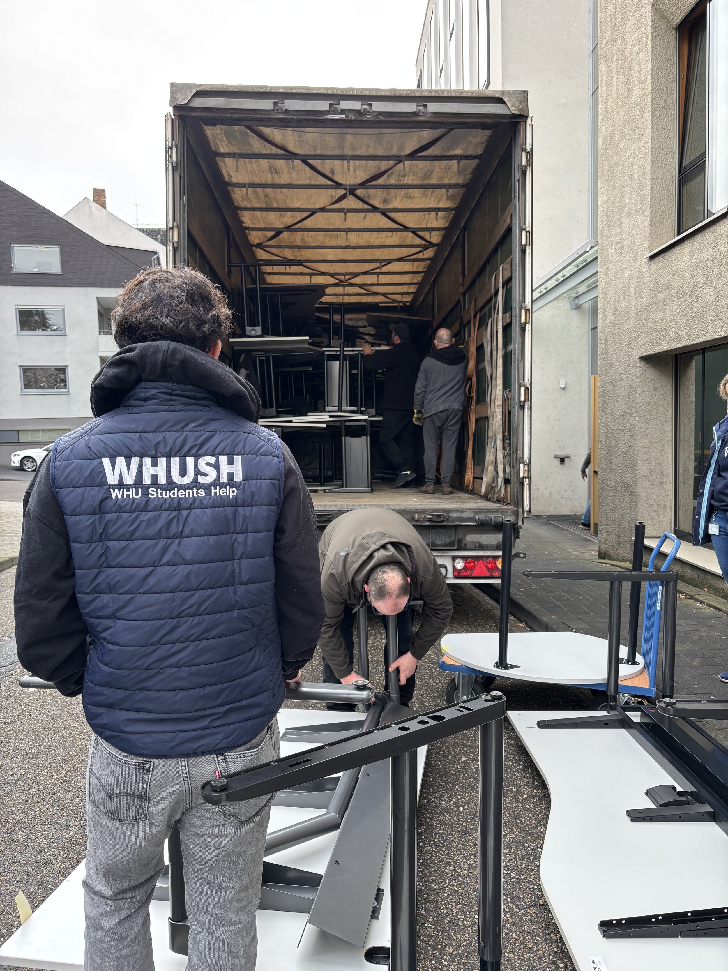 Im Auftrag der Gesellschaft wurde so am 17. März einmal mehr ein Lkw mit Hilfsgütern von Deutschland aus in die Ukraine geschickt. 15 Unterstützerinnen und Unterstützer der Business School trafen sich am Morgen und halfen dabei, 66 Tische, Stühle und Regalschränke aus WHU-Beständen auf den Lkw aus der Ukraine zu verladen. Zwei Stunden später war der Sattelzug voll und konnte mit dem Mobiliar in Richtung Osten aufbrechen.